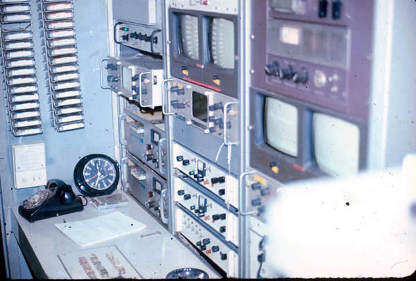This is the TV Control Room in the van. To the rear (in this shot) is the small booth used for the news, before we built the TV studio in the main building. The video switcher is in the desktop. In the center rack is the sync generator and two camera control units, all made by Sarkes Tarzian. At the time this picture was taken, there were only two video cameras in the station, one in the news booth and the other in the film chain, located between this control position and the transmitter. The transmitter was a tube type, made by Gates. It had 5 KW for video and 400 Watts for audio.